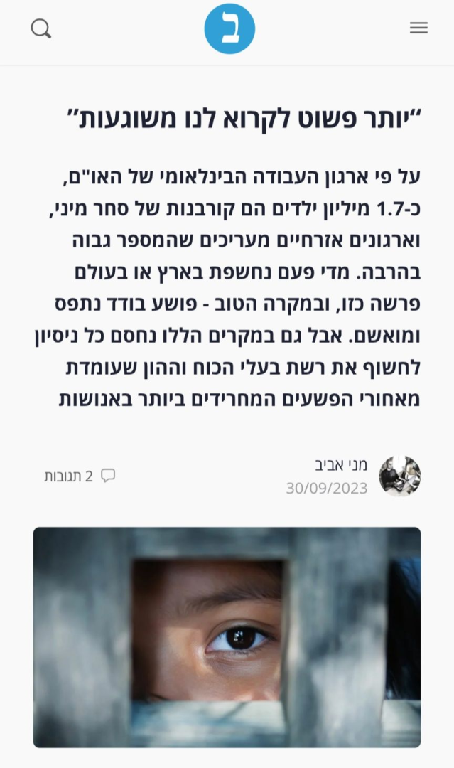 מאד קשה לקרוא ולהכיל את המידע, אבל חובה לקרוא ולהכיר את הנושא המטריד הזה, שהיקפיו מתגלים כרחבים וכמפלצתיים בהרבה מכל שהדעת מסוגלת להבין. בסוף יש קישורים רבים לכתבות, סרטים ועדויות אישיות (רשימה מתעדכנת).
