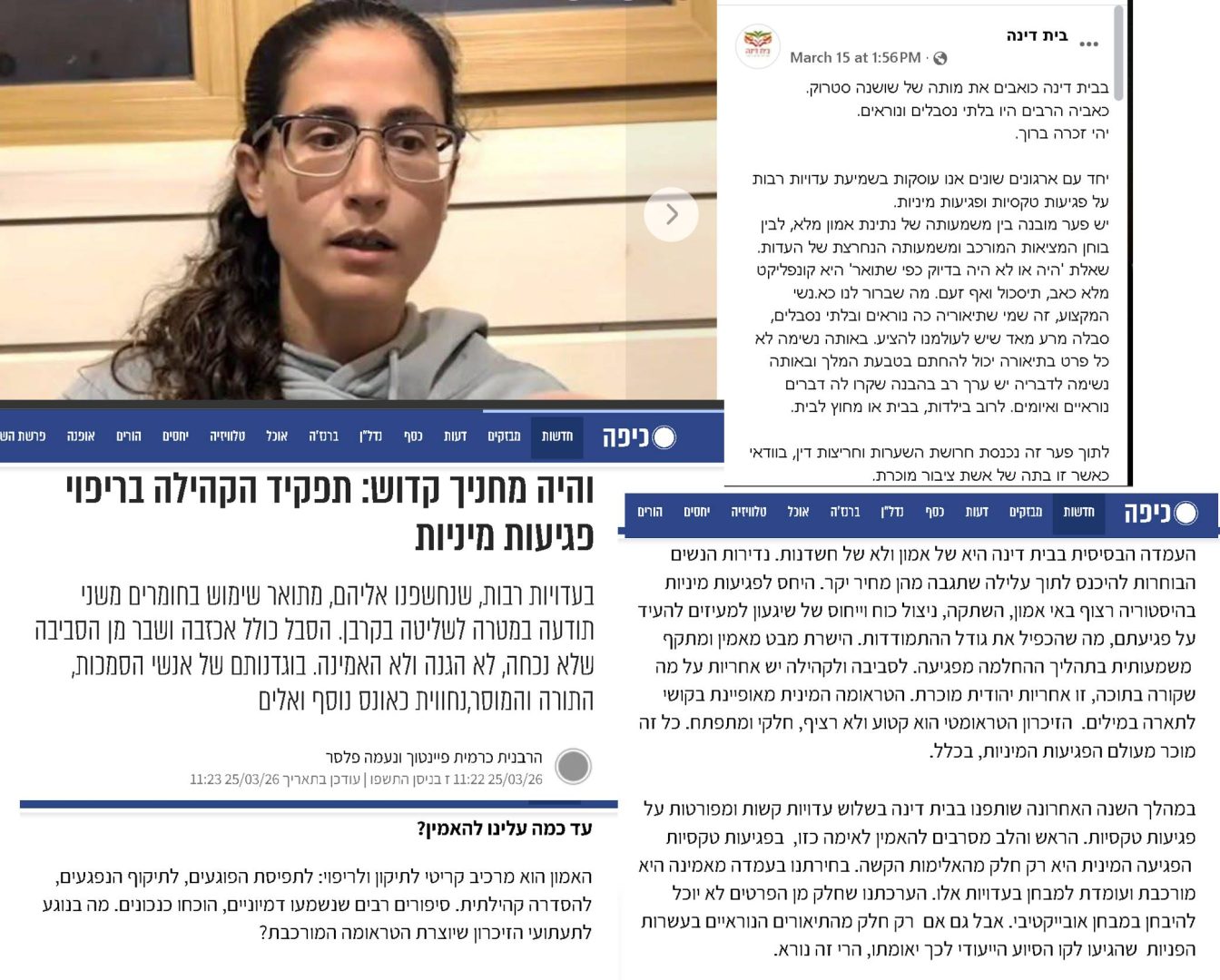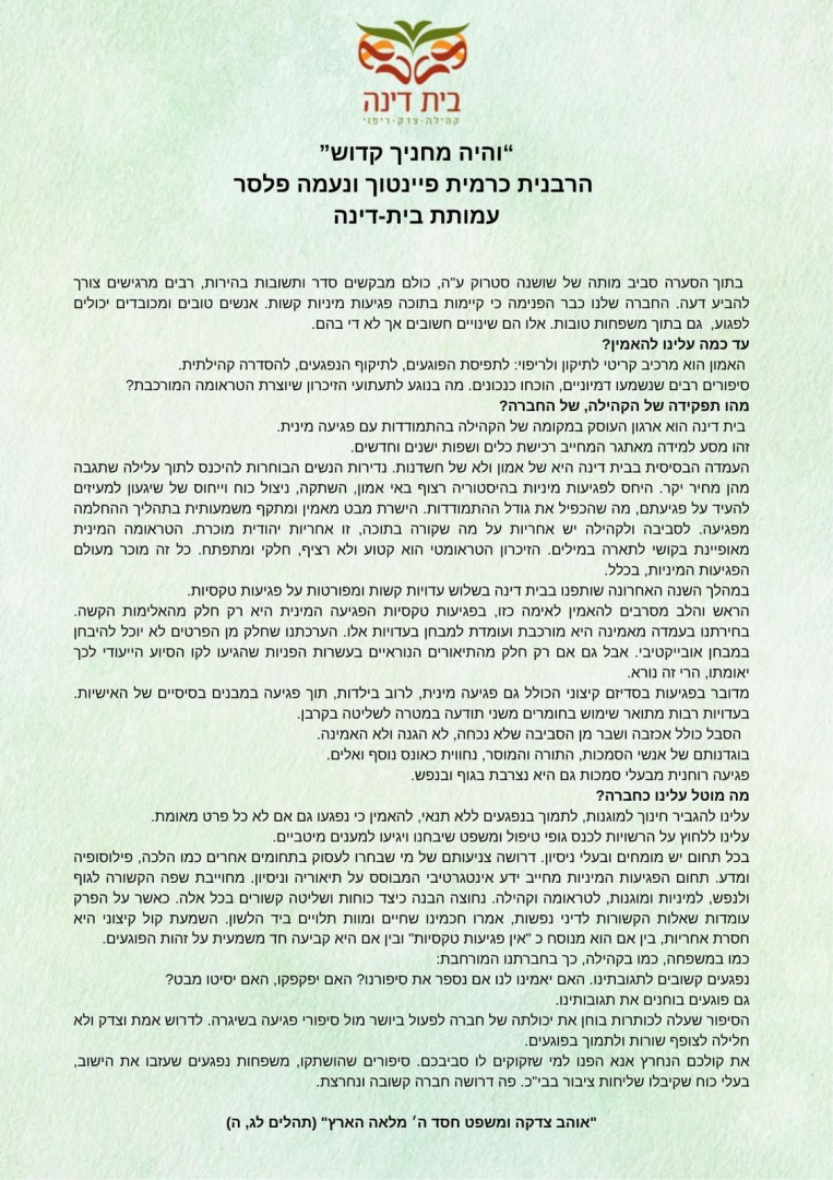 הן כתבו גם בפוסט בדף הפייסבוק של בית דינה על ההכרח להאמין לנפגעות (וזה לא אומר הכרעה משפטית)