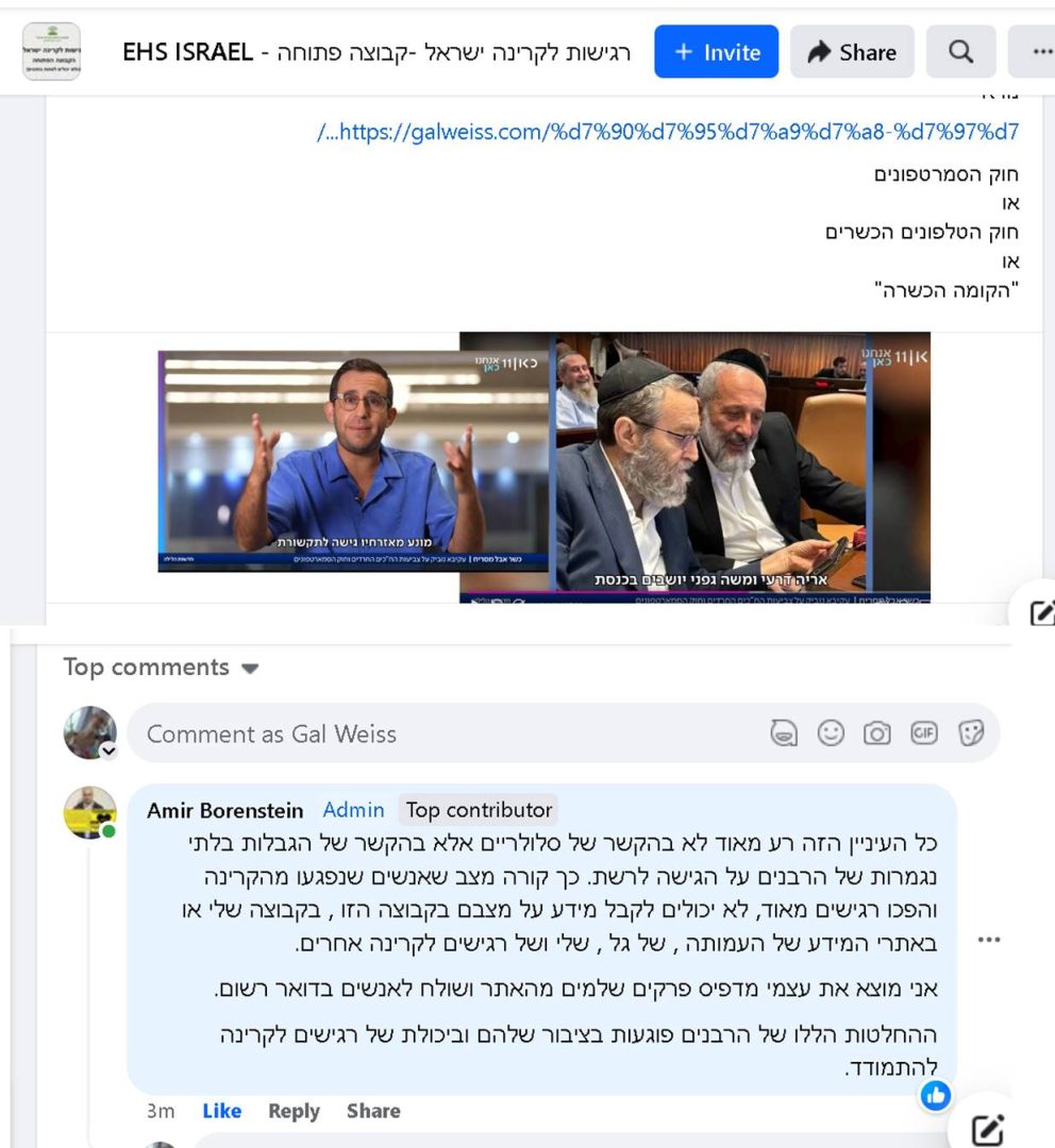 הנה תגובתו על עמיר בורנשטיין על פוסט בנושא – בקבוצת רגישות לקרינה ישראל, הקבוצה הפתוחה, בפייסבוק (שחסומה אף היא בטלפונים הכשרים)
