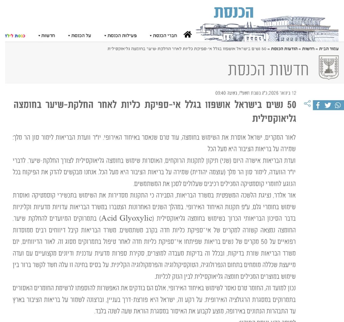 - איסור שימוש – משרד הבריאות המליץ ב- 2023 להימנע מתכשירי החלקה המכילים חומצה גליאוקסילית וכעת נאסר החומר לשימוש.