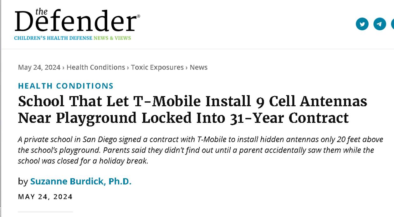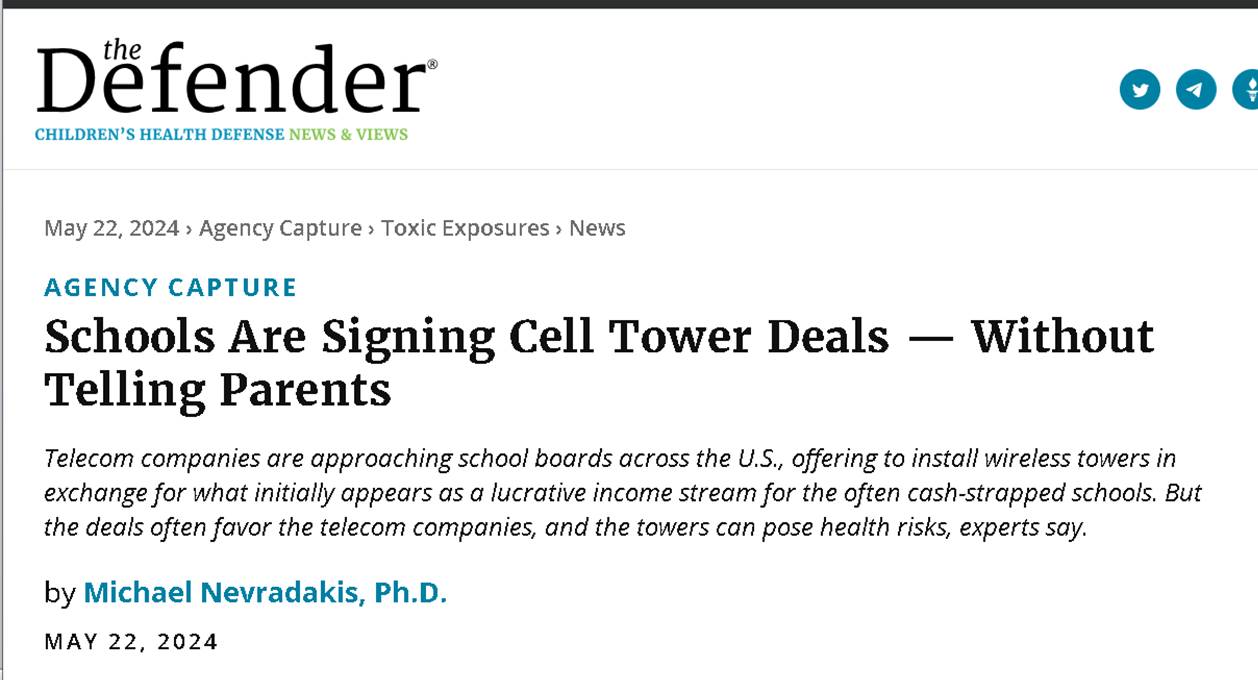 תעשיית התקשורת שמה לה למטרה להשתלט על מוסדות חינוך בארה"ב כבסיס לתשתיות המשדרות והמקרינות, מדווחת מערכת ה"דפנדר" של CHD. התקנת האנטנות (המוסתרות) נעשית בזמן חופשות לימודים, ללא ידיעת ההורים. והחוזים ארוכים ומחייבים. הנה דוגמא לבית ספר שהתקין 20 אנטנות ומתקני גישה וחתם על חוזה מחייב ל- 31 שנים עם חברת T-MOBILE