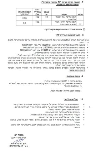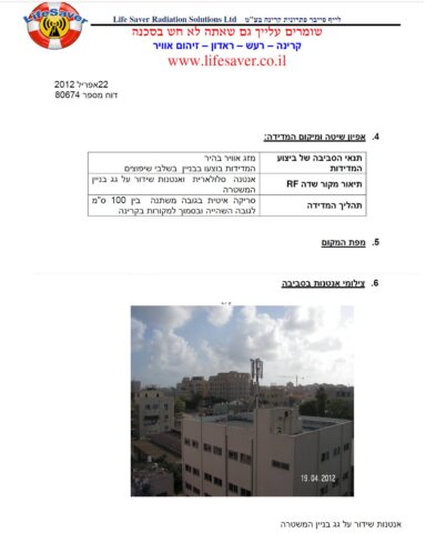 מ- 2004, כמעט 10 שנים גרתי מול אנטנה (שתי קומות נמוך יותר), מאז שהוקמה ללא ידיעתי. כשעברתי ב- 2012 לדירה שנבנתה על הגג, גיליתי את האנטנה. דוחות המדידה הרגיעו אותי מאד. המשכתי לגור בגובה זה (מול האנטנה באותו גובה) ולעבוד מולה כל היום – 40 מ' (ללא קירות וללא כל חסימה).