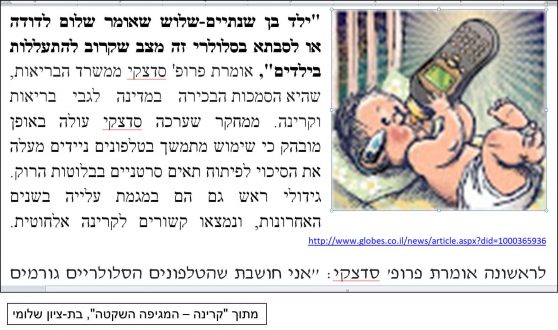 אמרה פרופ' סדצקי: "אני חושבת שהטלפונים הסלולריים גורמים לסרטן". http://news.walla.co.il/item/2965687 29.5.2016
