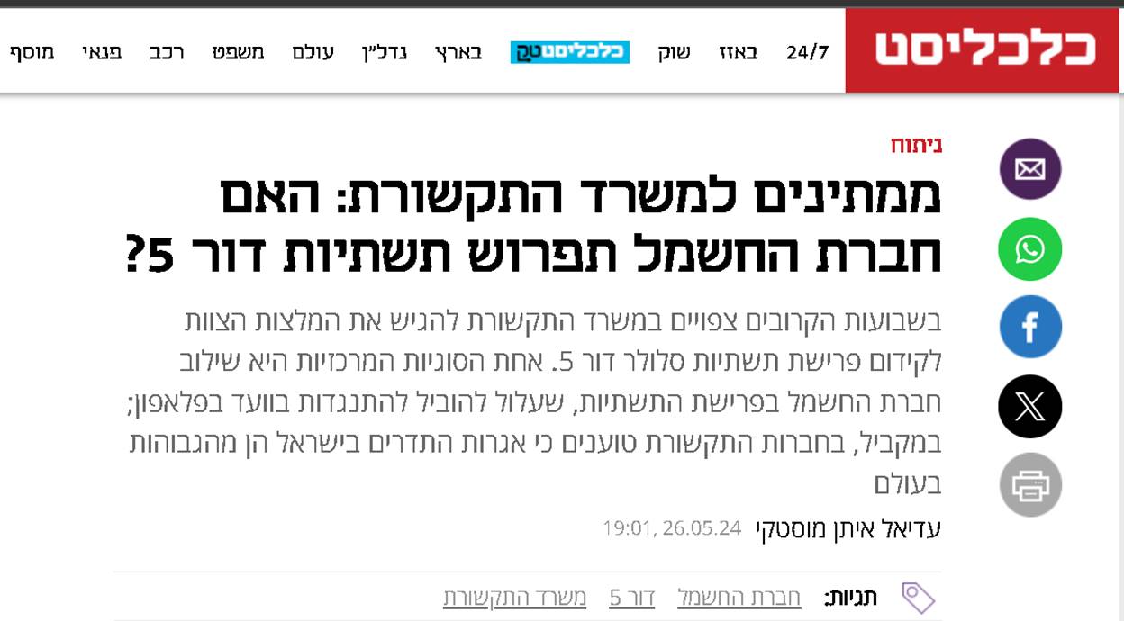 אחת הסוגיות המרכזיות היא שילוב חברת החשמל בפרישת תשתיות דור חמש, מדווח עדיאל איתן מוסטקי בכתבה ב"כלכליסט".