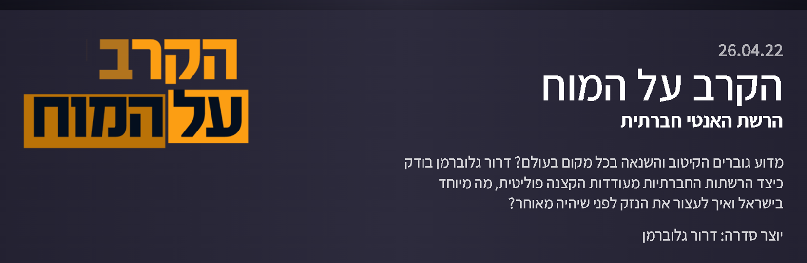 כתבות מעולות שעשה דרור גלוברמן בשנים האחרונות, כולל סרט על הקיטוב והשנאה הגוברים בשם ..