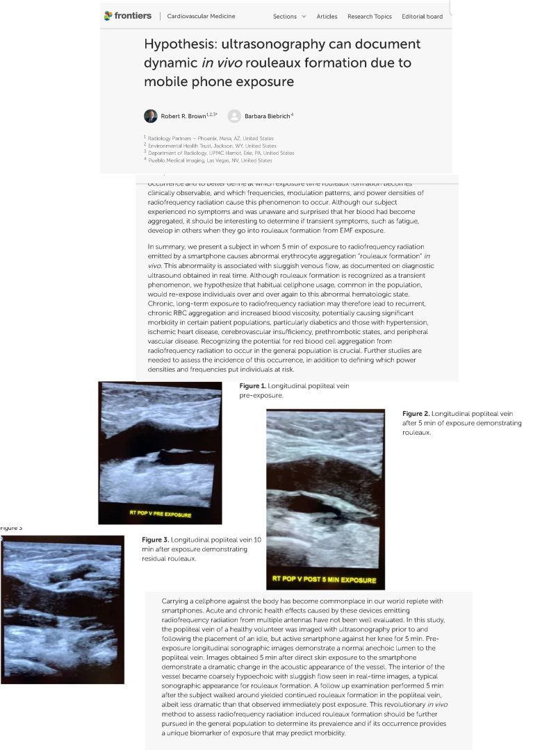 קישור – המאמר של EHT בנושא , שמציינים כי EHT בשיתוף אוניברסיטה מובילה יתחילו בקרוב מחקר רחב כדי ללמוד יותר. ובינתים ניתן לצפות בוידאו המראה את הדם לפני ואחרי חשיפות לקרינה מהטלפון הסלולרי. זאת, במאמר שעבר ביקורת עמיתים בכתב העת FRONTIERS IN CARDIOVASCULAR MEDICINE |