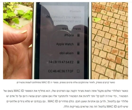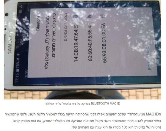 - נדרש סלולרי שיכול להראות מכשירי בלוטות' ללא שם. שיציג כתובת MAC, הנראת כמו מספר מורכב: 14:CB:19:47:64:E? או משהו דומה. הבדיקה נעשית בביצוע "סריקת מכשירי בלוטות'" מהסלולרי. אם עולים מספרי MAC ID זה לא אומר שיש מחוסנים בסביבה, אלא ציוד אלחוטי וסלולרי שמחזיר MAC ID,