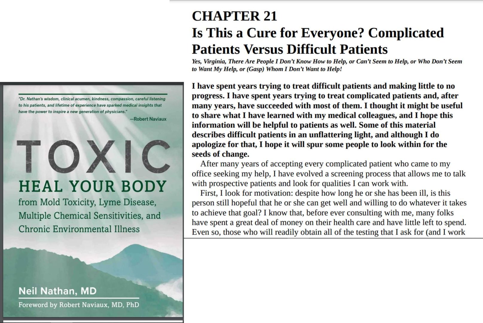 דר' נית'ן מעיד כי עשרות שנים העביר בניסיון לסייע לחולים "קשים" בלי שתהיה כל התקדמות, בעוד שנים הקדיש לטיפול במצבים מורכבים ומסובכים וההתקדמות היתה איטית אך התרחשה והגיעו הצלחות לאחר התמדה. הוא מנסה לנתח את ההבדלים ומתנצל על הנימה השלילית בה יתוארו החולים ה"קשים", אך הוא מקווה שזה יועיל להניע שינוי. שאותם "חולים" יבחנו את עצמם, שצוותי רפואה יבינו ואולי זה יסייע.