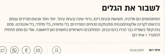 "בישראל, לעומת זאת, מדינה שבה יש יותר מכשירים סלולריים מאזרחים, התופעה אינה מוכרת כמעט בכלל, והסובלים נאלצים להתמודד לא רק עם הסימפטומים, אלא גם עם חברה וממסד רפואי שלרוב מסתכלים עליהם כעל מי שסובלים מבעיות נפשיות". (לצערנו – זה לא השתנה. רק החמיר כי כמות הנפגעים עלתה, אך הקושי לאבחן את הקשר לקרינה גובר כיון שהקרינה הסביבתית כה גבוהה והמודעות לסיכוני הקרינה פוחתת בדרות שנולדו לעולם עתיר ציוד סלולרי ואלחוטי – גל)