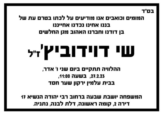 בצער אני מודיעה כי נפטר שי דוידוביץ'.