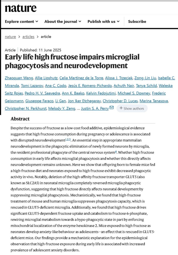 מחקר זה מתאר קשר מנגנוני בין צריכת פרוקטוז, טרנספורטר ספציפי לפרוקטוז, והתפתחות נוירולוגית לקויה בגלל פינוי כושל של תאי עצב מהמוח.