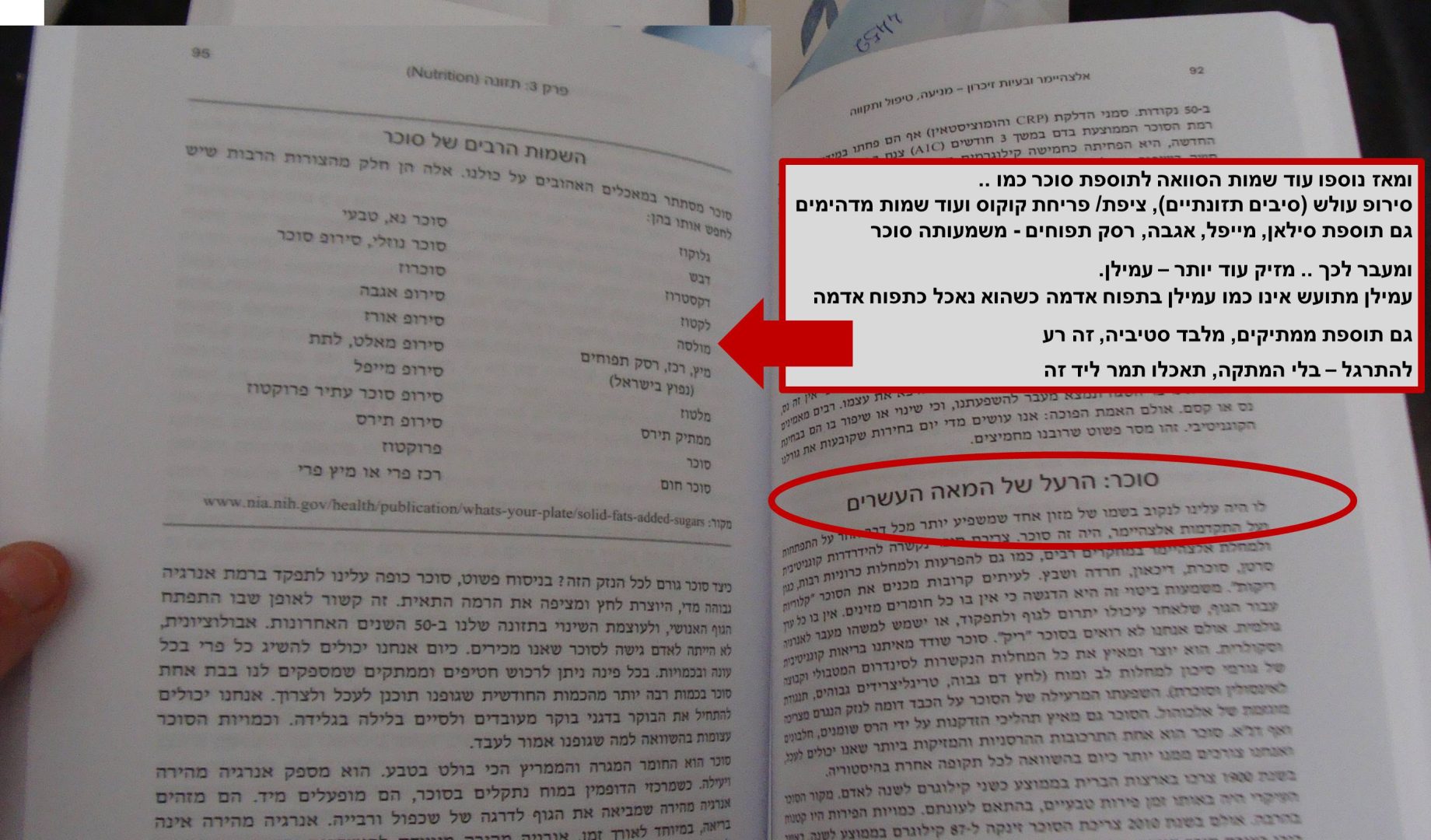 צירפתי לספר דוגמאות לשמות מתחכמים של התעשייה, שנועדו להטעות את הציבור ולהסוות תוספת סוכר למזונות מעובדים. מאז כתיבת הטבלה נוספו עוד שמות יפיפיים כמו "ציפת פריחת קוקוס" או "סירופ עולש/ סיבים תזונתיים".
