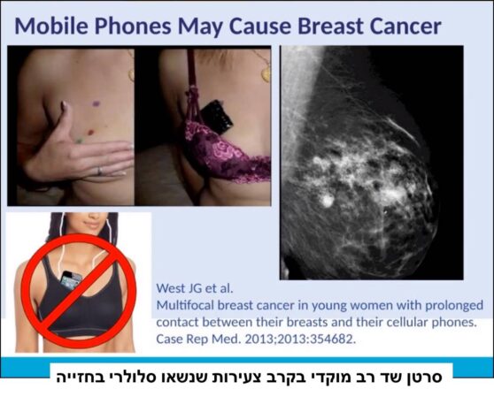 שקף הדגמה (נוספת) לגידולי סרטן שד שנגרמים מהסלולרי מדובר בגידול רב מוקדי, כאשר המוקדים ממוקמים בסמוך למיקום האנטנות, שנושאות המטופלות בחזייה. זוהי ראייה, שמדגימה באופן קל להבנה את הקשר הסיבתי בין חשיפה לקרינה מהמכשיר הקרוב לגוף לבין התפתחות גידולים סרטניים (ראייה חשובה כיון שחלה עלייה בסוגי סרטן שסמוכים לאיזורים בהם משתמשים או נושאים את הסלולרי, … המשך לקרוא סרטן שד והקשר לסלולרי
