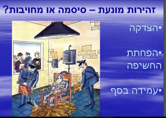 ונקנח בשקף "הומוריסטי", שבחירתו מראה מה כבוד הפרופ' מרגיש בין הפטיש לסדן (משרד הבריאות ומשרד התקשורת) .. כשהאגף בהנהלתו נחנק עם הצורך לשמור על עיקרון ההיזהרות