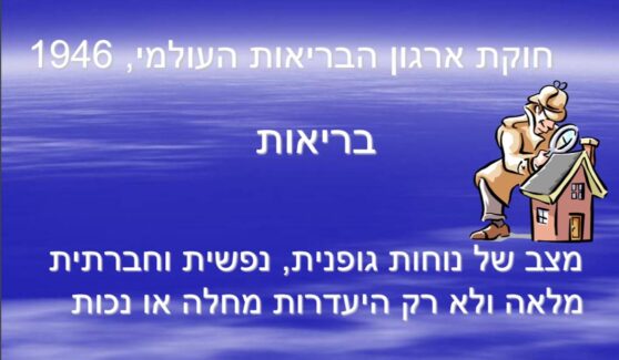 כתזכורת למשרד הבריאות מהי בריאות, נביא מהמצגת של פרופ' סטיליאן גלברג את ההגדרה מחוקת ארגון הבריאות העולמי, 1946