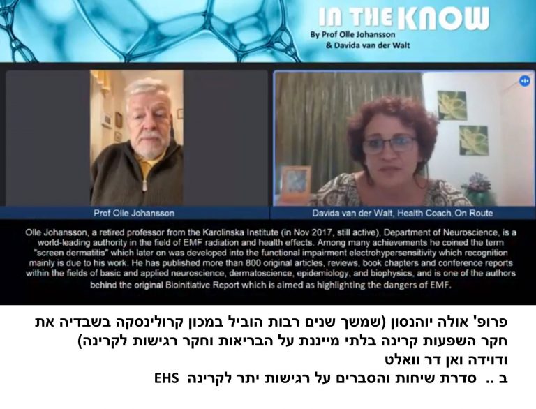 פרופ' אולה יוהנסון הוביל שנים רבות את חקר השפעות קרינה בלתי מייננת על הבריאות וחקר רגישות לקרינה, במכון קרולינסקה בשטוקהולם. וכעת .. בסדרת שיחות והסברים על רגישות יתר לקרינה EHS עם דוידה ואן דר וואלט (באנגלית) https://www.youtube.com/channel/UCwM_TlDC11Ur8wRr3Z3Vfew . כמה רגישות ורגישים לקרינה יש? דר' יעל שטיין, מבית החולים האוניברסיטאי "הדסה עין כרם" ענתה על … המשך לקרוא רגישות לקרינה – פרופ' אולה יוהנסון מסביר
