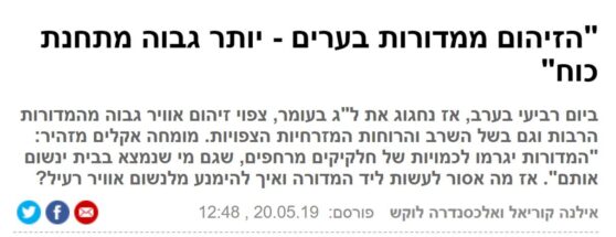 פרופ' עודד פוצ'טר, קלימטולוג שהתמחה ביחסי אקלים, אדם וסביבה ממכללת בית ברל, הזהיר באולפן ynet מרמת הזיהום הנגרמת ממדורות ל"ג בעומר: "כמות גדולה של מדורות קטנות יכולה להיות יותר מסוכנת מתחנות כוח, כי תחנת כוח ומרוכזת בנקודה מסוימת והארובה שלה היא בגובה, ואילו מה שיקרה אצלנו, עשרות אם לא מאות אלפי מדורות קטנות ברחבי העיר יגרמו לכמויות של חלקיקים מרחפים גדולות מאוד, שגם מי שנמצא אצלנו בבית ינשום את הזיהום הזה"
