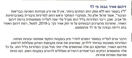 ועוד אמר "צריך לסגור טוב טוב ולאטום את הבית, בעיקר אנשים שנמצאים בדרגות סיכון כאלה ואחרות כמו חולי אסטמה, חולי מחלות ריאה, נשים בהיריון, רצוי שיהיו בבית עם מיזוג אוויר, לאטום את הבית ככל שאפשר ולהפעיל מזגנים. לגבי מי שמדליק מדורה, יש להקפיד שהמדורה תהיה קטנה ככל האפשר, ושהעצים יהיו עצים טבעיים ככל האפשר. לא לזרוק עצים מצופים בלק, לא לזרוק קופסאות של דיאודורנטים, לא לזרוק אספלט, לא לזרוק צמיגים וניילונים, מכל אלה להימנע. זה לא יהיה אולי ברקע הכללי, אבל זה יהיה נקודתי – מי שיהיה קרוב לנקודה שיש בה צמיגים, ינשום הרבה אוויר רעיל".