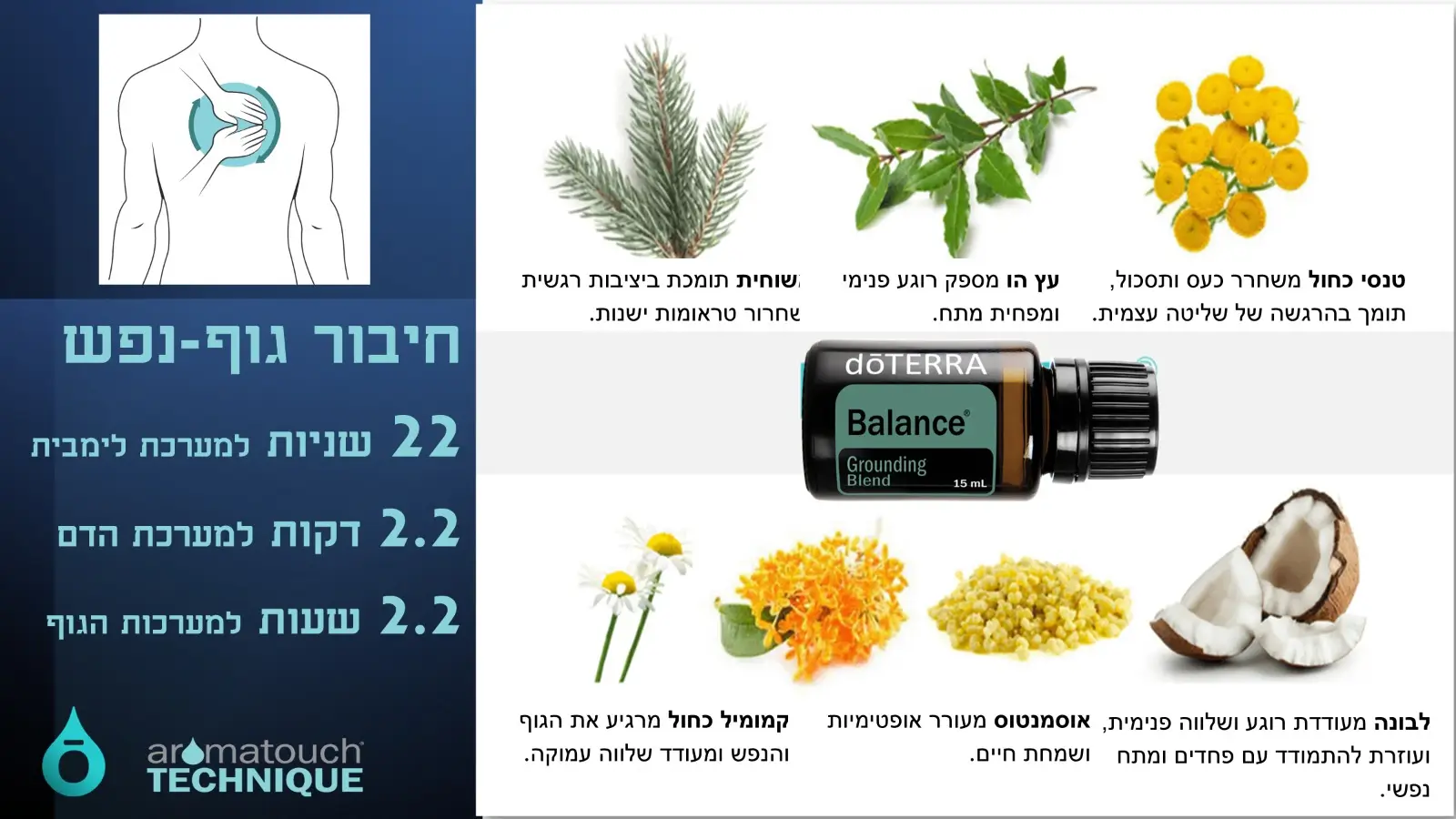 "באלאנס" נחשב הראשון מ- 8 שמנים בטכניקת AromaTouch של דוטרה. שמן המיועד ליצירת חיבור ראשוני בין מטפלת למטופל. אמור לסייע לחזור לרגע הנוכחי.