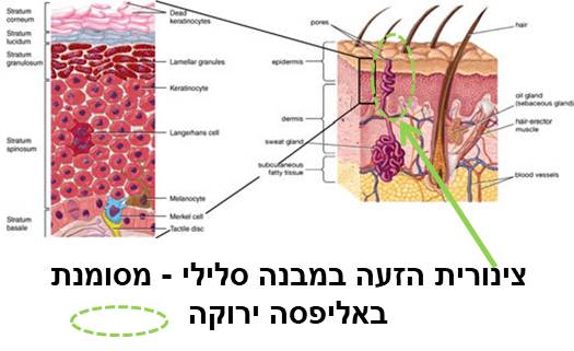 הדמיות מתוך מאמר מ- 2017 של פרופ' פלדמן ודר' בן ישי, המציג הדמיות של העור ואברוני ההזעה בתאים שמגיבים לקרינה. באיור חתך עור אדם, כולל שכבות היפודרמיס, דרמיס ואפידרמיס. בלוטת הזעה וצינורית הזעה סלילית מימין. מקור Pinterest and Encyclopedia Britanica, Inc.
