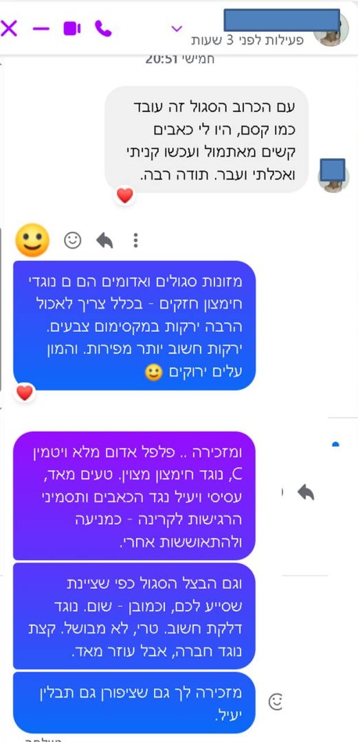 ובהקשר זה, צילום הודעה שנשלחה אלי אתמול מרגישה לקרינה (שגם בנה רגיש לקרינה), שירקות שהמלצתי לה לאכול טריים סייעו להתמודדותם עם תסמיני הרגישות לקרינה. ירקות ופירות, המכילים נוגדי חימצון, ומזונות טבעיים נוגדי דלקת טובים מאד להתמודדות עם תסמיני הרגישות לקרינה ולחיזוק הגוף