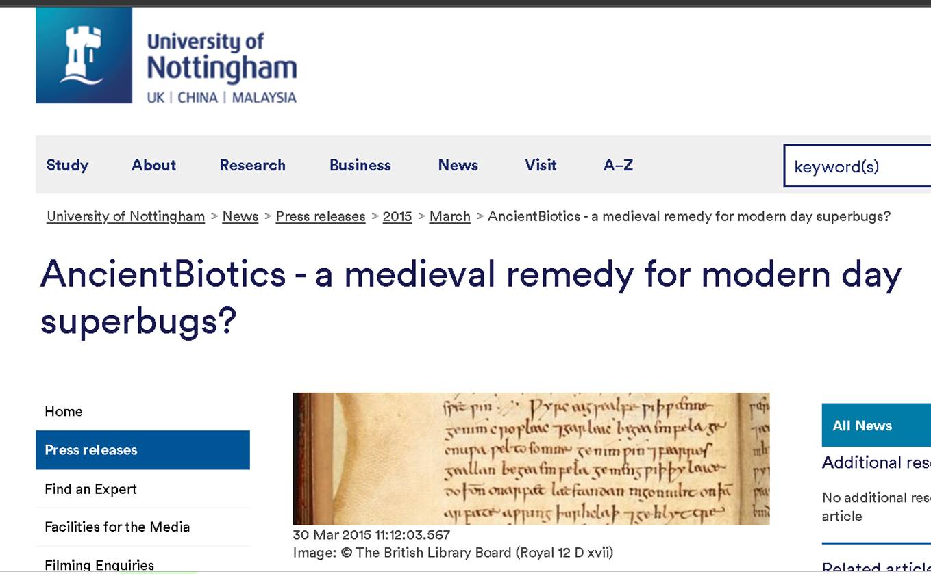 חוקרת מאוניברסיטת נוטינגהאם תרגמה את המתכון למשחת העיניים. צוות המחקר רקח את התרופה ובחן את יעילותה על חיידקי MRSA. הם חשבו שתהיה למשחה השפעה אנטיביוטית קלה ונדהמו מהתוצאות (חיסול 90% מהחיידקים). כעת הם מעונינים לבדוק את כל התוכן בכתב היד הרפואי העתיק (שנמצא בספרייה הלאומית הבריטית), מתוך השערה כי טמונים עוד אוצרות נגד זיהומים בקטריאליים. תרופות שנוצרו והיו בשימוש מאות שנים, תוך תצפיות על יעילותן, הרבה לפני שחיידקים ויצורים מיקרוביאליים התגלו (לפני המצאת המיקרוסקופ).